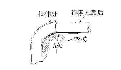 芯棒太靠后——芯棒稍稍往前,前部不產(chǎn)生皺紋但開始在切點(diǎn)后部產(chǎn)生。芯棒位置仍不夠靠前以在內(nèi)側(cè)產(chǎn)生必要的壓力,收縮材料。彎曲可能開始光滑,但當(dāng)彎過約20度時(shí),材料后退在A處產(chǎn)生波紋(如圖9)。在芯棒和彎模間該波紋不斷產(chǎn)生并受壓。但波紋不會(huì)完全消失。從彎模取下彎好的管子,在A處會(huì)有一個(gè)較大的皺折。有必要再推進(jìn)芯棒,直到材料不會(huì)在芯棒和彎模間受擠壓。圖10說明芯棒不完全推進(jìn)的后果。